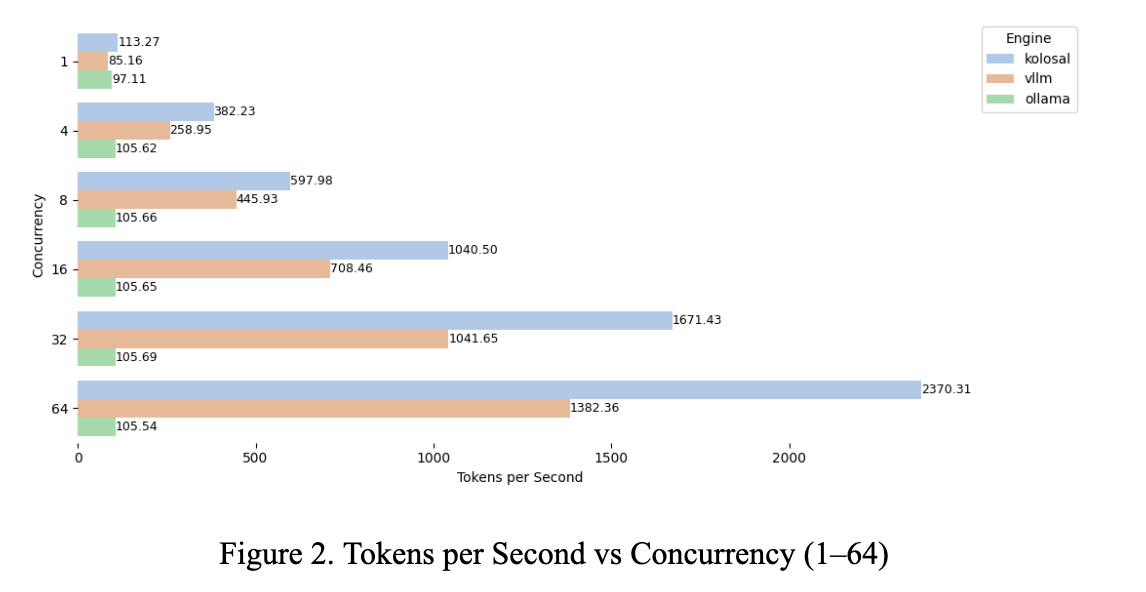 Across all tested concurrency levels from 1 to 64, Kolosal achieves 113.27 to 2,370.31 tokens per second, exceeding vLLM’s 85.16 to 1,382.36 and Ollama’s 97.11 to 105.54. On average, Kolosal sustains 1,029.29 tokens per second—about 70.48% higher than vLLM (603.75 tps) and 9.88 times higher than Ollama (104.21 tps). At a concurrency of 32, Kolosal achieves 1,671 tokens per second, which is 60.45% higher than vLLM and 15.81 times higher than Ollama; at 64, it delivers 2,370 tokens per second, 71.46% above vLLM and 22.46 times higher than Ollama. Ollama effectively plateaus near 105 tokens per second regardless of concurrency, while Kolosal continues to scale, providing the strongest throughput headroom of the three engines.