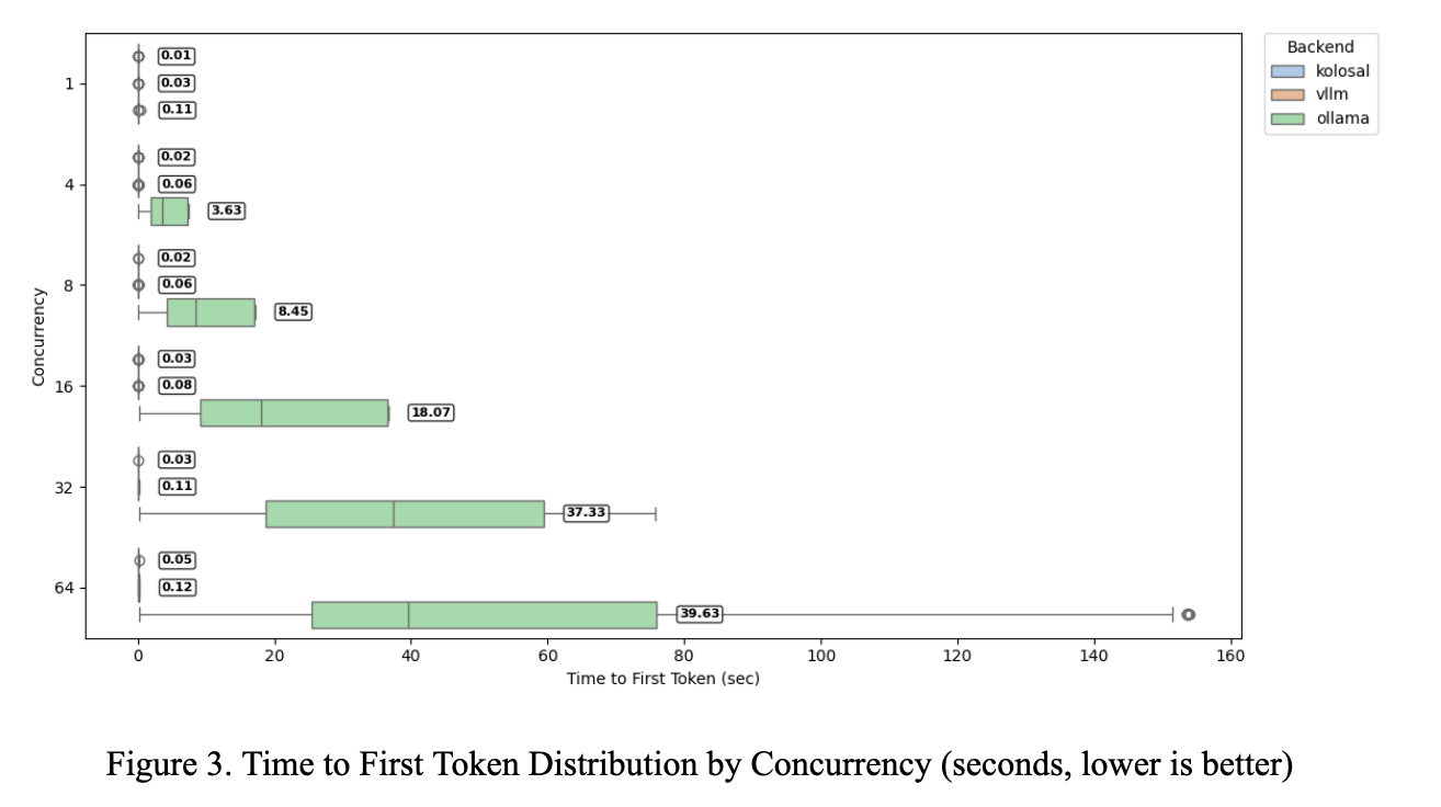 The TTFT box plot shows Kolosal near zero across all loads (0.01–0.07 s from concurrency 1–64). vLLM ranges 0.03–0.13 s. Ollama increases from ~0.11 s into tens of seconds with heavy tails, with mean TTFTs of ~3.6, 8.5, 18.1, 37.3, and 39.6 s at concurrencies 4, 8, 16, 32, and 64. At concurrency 32, Kolosal is 0.03 s versus vLLM’s 0.11 s (3.7× faster; −73%) and ~37.3 s for Ollama (~1,240× faster; ~99.9% lower). At 64, Kolosal is 0.07 s versus 0.13 s for vLLM (1.9× faster) and 60.81 s for Ollama (~870× faster). Variability is minimal for Kolosal and modest for vLLM; Ollama shows wide dispersion and outliers. Overall, Kolosal maintains lower and more stable TTFT as concurrency scales.